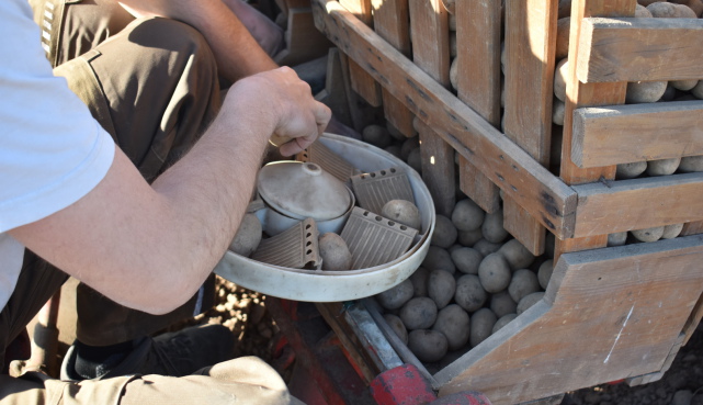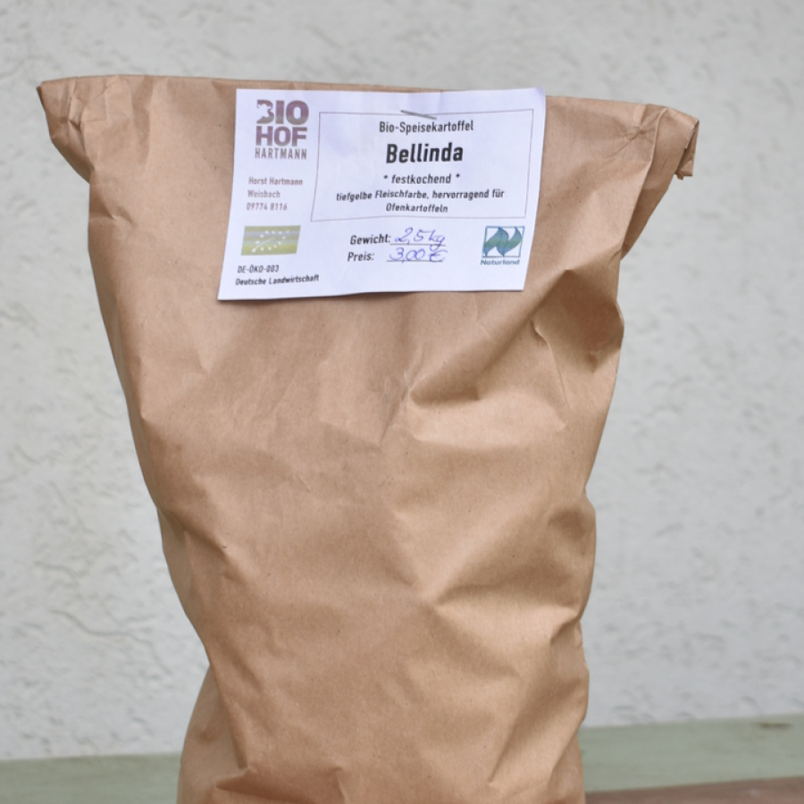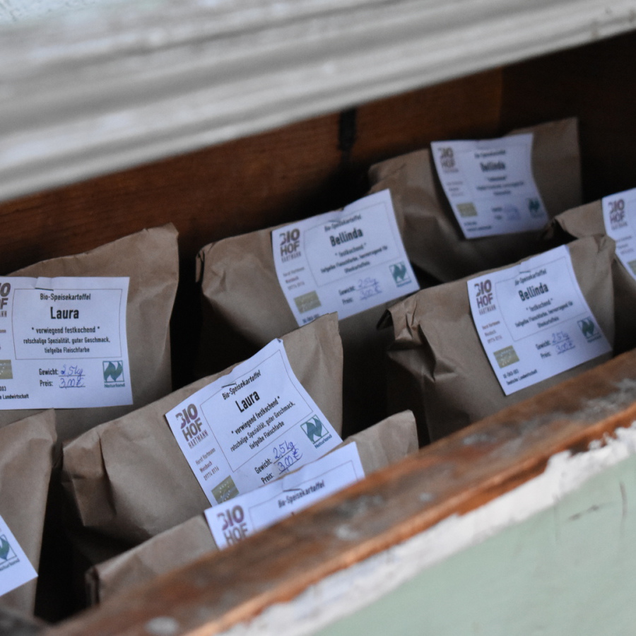 Die Kartoffeln in der Kiste sind in 2,5 kg-Säcke verpackt. Größere Größen (5 kg, 10 kg und 25 kg) können Sie gerne vorbestellen.