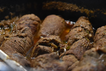 4. Am Ende der Garzeit die Rouladen herausnehmen, die Spieße entfernen und warmstellen. Das Gemüse durch ein feines Sieb passieren, bei Bedarf mit Brühe auffüllen, mit Salz und Pfeffer abschmecken und mit einem Schuss Sahne oder Schmand verfeinern. Ggf. mit etwas Speisestärke binden.