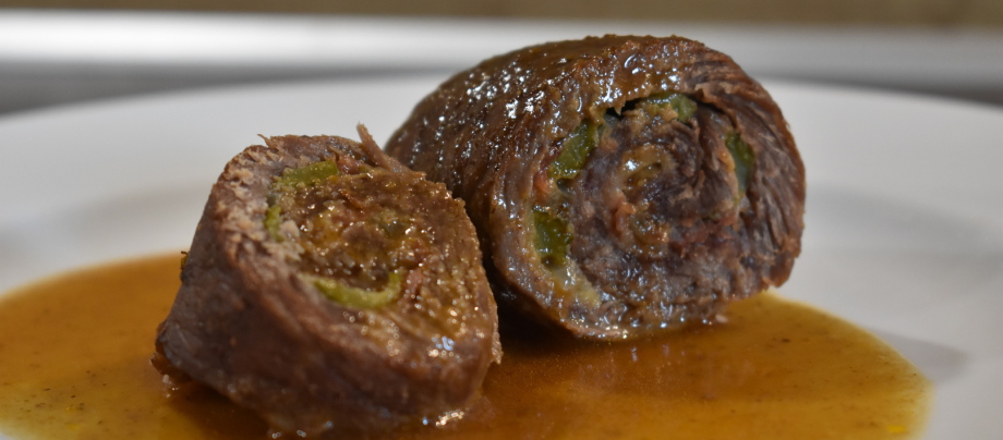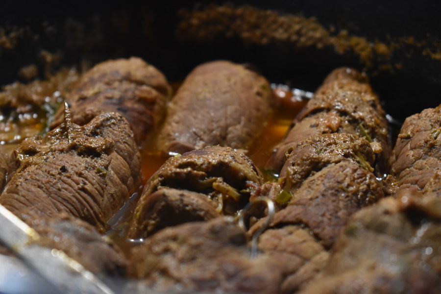 1. Die ausgebreiteten Rouladen werden dünn mit Senf bestrichen, dann mit je einer Scheibe Schinkenspeck, einigen Zwiebelringen und ein paar Scheiben Gurke belegt. (Salz und Pfeffer kann man nach Belieben noch drüber streuen). Dann aufrollen, mit einer Rouladennadel oder einem Zahnstocher fixieren.