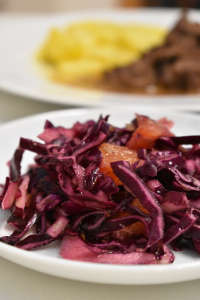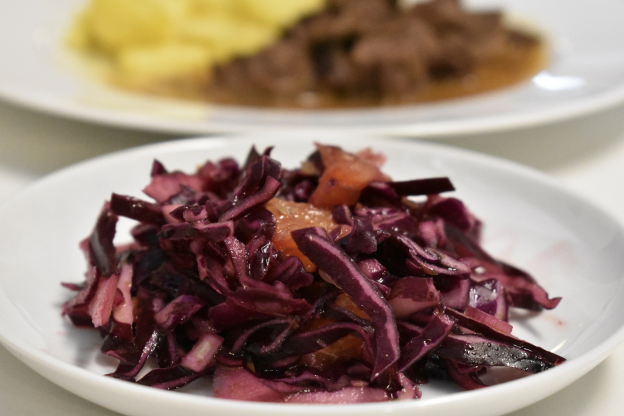 2. Danach werden erst die Zwiebeln fein gewürfelt, dann die Orangen filetiert und ebenfalls gewürfelt und unter den Rotkohl gemischt.